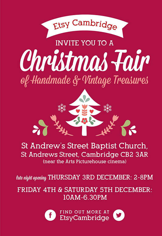 Etsy Made Local arrives in Cambridge at 2pm on Thursday 3 December. It will run thereafter of Friday 4 December and Saturday 5 December from 10am until 6:30pm. It will be held at St Andrews Street Baptist Church