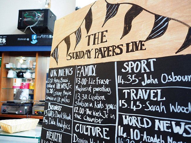 What? A chance to see the Sunday papers brought to life while you relax and enjoy geat food, drink and hands-on activities.