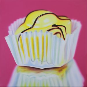 As for Graham, her art is gloriously vibrant, depicting delicious confections drenched in colour. Among these, find decadent French Fancies, ribbon-wrapped candies and fruity Chupa Chups lollipops – all starkly foregrounded and set against diffused, smoothly blended backgrounds. They’re a real visual feast. Check out I Fancy You for an especially potent hit of nostalgia; its rich, glazed rhubarb-and-custard colours will take you back to your childhood sweet-shop days – or at least have you licking your lips.