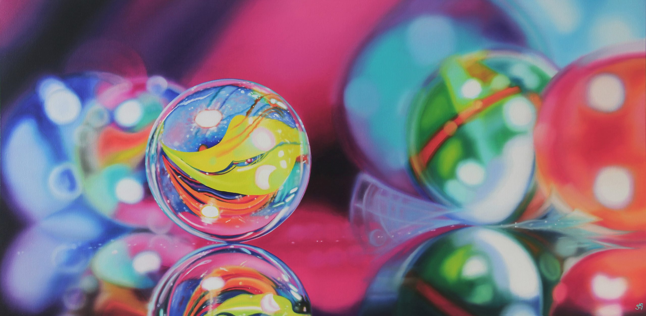 CJ Green combines oil and acrylic paints – and the results almost defy logic in their ability to replicate reality. The artist tackles reflective glass and chrome surfaces with aplomb, setting them against clean colour palettes in sparse compositions that offer nowhere to hide. Jelly Bean Jar is a particularly satisfying example, but be sure to look out for his deceptively modest series of egg cups, too.