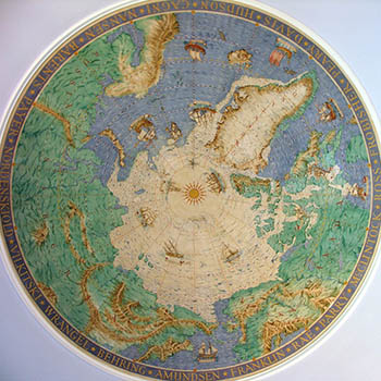 Look very closely at the Arctic map and you’ll see a grey balloon near the centre: it’s actually the airship which made the first successful flight over the Pole in 1926. Interestingly, around this time a new story appears in Inuit legend about a flying whale…