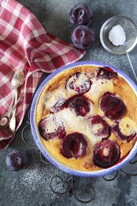 It is easy to be complacent with produce that nudges perfection. But often complacency prevents complication and the fruit was so good we wanted merely to allow it to bask in its own brilliant glow: unfussed, unsullied and untarnished – maybe a couple of supporting actors allowing it to shine. Stewing fruit is one way to amplify the flavours but maybe a little further down the line. Now, whilst there is more balance in the fruit, baking is a far better option, and clafoutis has long been my favourite method of showcasing stone fruits at this time of year.