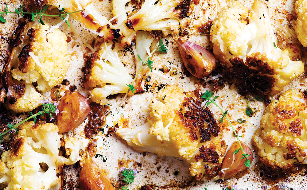 But my favourite method is one I took from a René Redzepi book. It is one I return to time and time again and is probably the easiest and most versatile: a whole cauliflower, divested of its leaves and with its base trimmed so it rests flat, is roasted in a covered casserole with whatever flavours you wish to pair it with (one of the most exciting things about cooking caulis is just how welcoming they are to whatever spices or herbs you care to throw at it – they are like the friend who you know you can invite to any dinner party). Woody herbs, garlic and warm spices work particularly well but feel free to be bold and adventurous – rose water and dark chocolate is a crazy-sounding but wonderful combination.