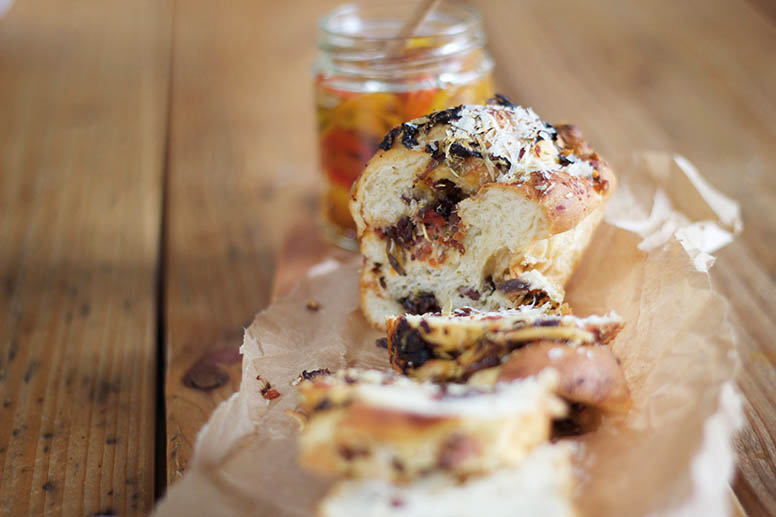After the dough has risen, turn onto an oiled surface and thinly stretch with your hands to get a large square. Layer with the chorizo and the onion compote. Sprinkle with dried oregano and grated parmesan. Roll the dough tightly, as you would a swiss roll.