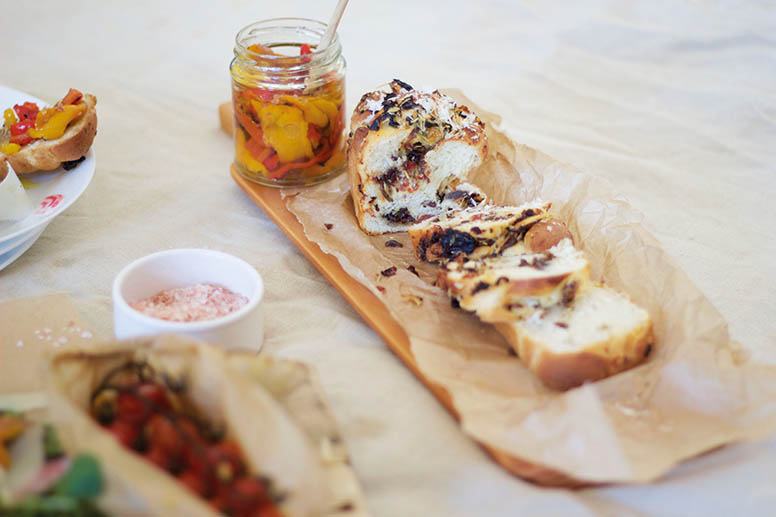 After the dough has risen, turn onto an oiled surface and thinly stretch with your hands to get a large square. Layer with the chorizo and the onion compote. Sprinkle with dried oregano and grated parmesan. Roll the dough tightly, as you would a swiss roll.