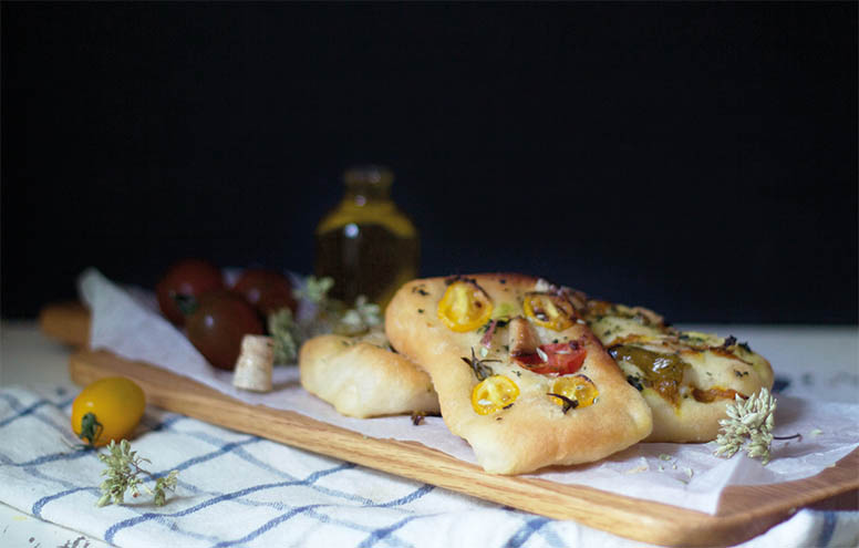 Divide dough into four portions. Gently flatten dough onto a baking tray, poke and sprinkle with rosemary or thyme and oregano. Stud with tomatoes, olives and roast peppers or a mix of your own favourites, and drizzle with olive oil. Allow to prove for 1 hour.