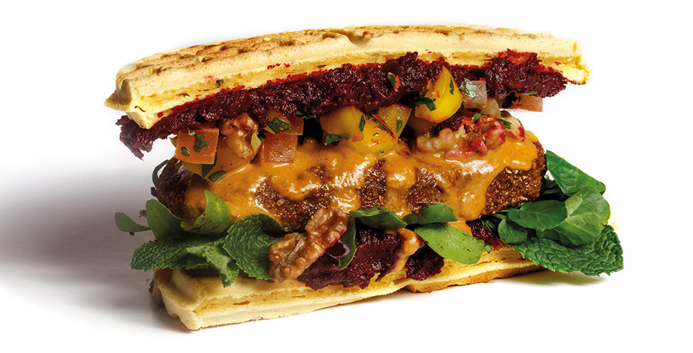 Faced with the prospect of relentless bean burgers, newly vegan Alfy soon started wondering what to do with the format of something-in-a-bun. “I wanted to make a decent burger, but the aim was never to make it taste like meat. We were never trying to replicate,” he explains. “My thing was that, texturally, a bean burger’s bad. It just turns to smush. If you have something between two bits of bread that has a bit of texture – because there’s no meat in it – it frees you up to do more interesting things. With a burger, you’ve got the taste of beef, and beef should be what a burger tastes like – whereas with a vegan burger that’s not trying to be beef… what could you put in it?”
