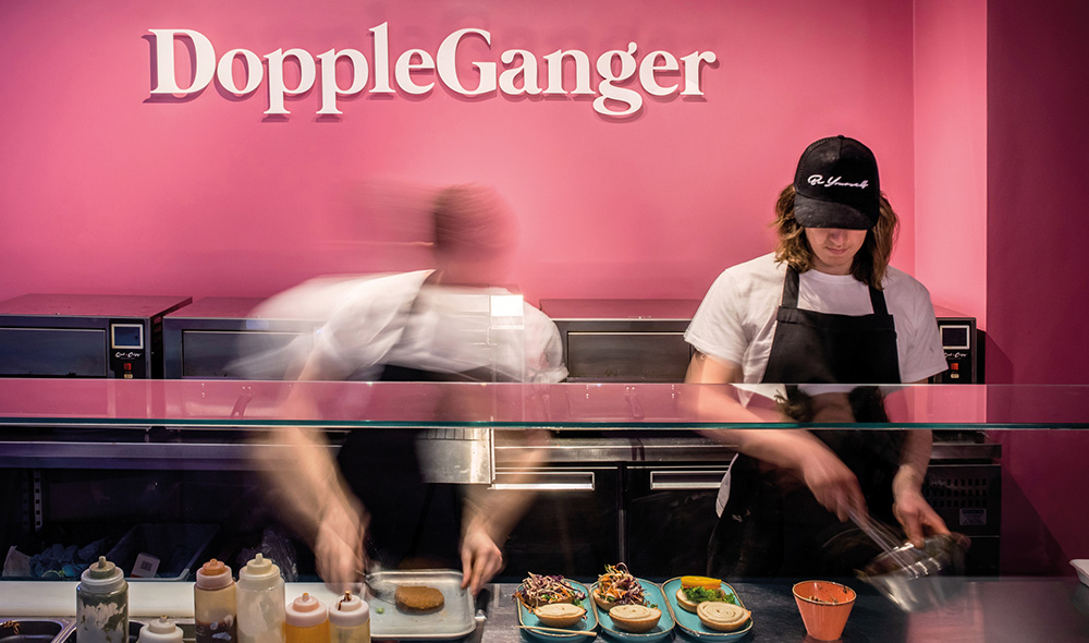 He’s quick to defend DoppleGanger against accusations of unhealthiness. “Just because it’s a burger, and it looks a bit dirty… You’ve just seen the mushrooms being roasted. Nothing in what we make is ‘dirty’.” DoppleGanger’s bank of air fryers use a fraction of the amount of oil required to deep fry, surrounding food with a blast