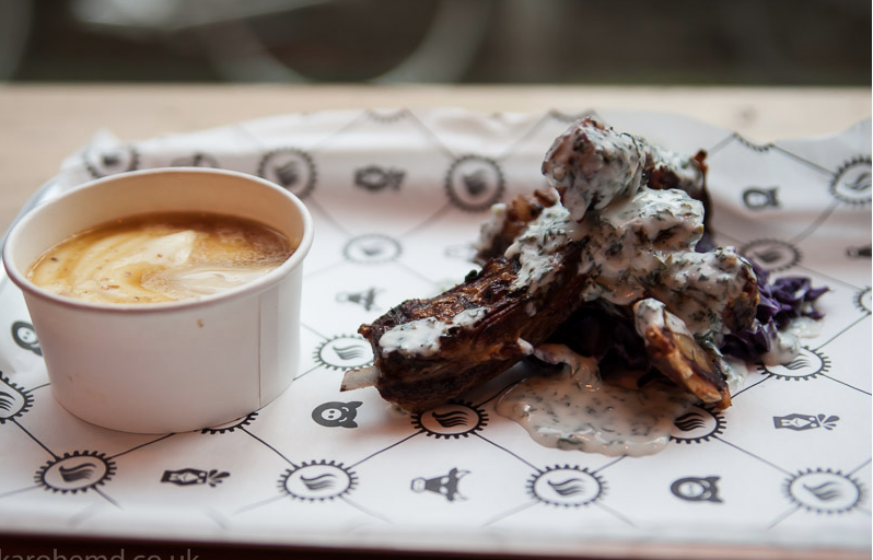Over on the other side of the booth, the ribs were going down equally well: cooked low and slow in an oven specially imported from the barbecue motherland, America, the beef had an incredible smoky flavour and was so tender it fell off the bone.