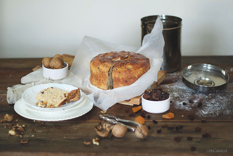 • 300g plain flour • 150g warm milk • 10g fresh bakers yeast • 50g sugar • 50g butter • 2 large eggs • 1/2 tspn ground cinnamon • 2 tbspn Aguardente / Grapa • 50g Figs • 50g walnuts • 50g sultanas • 50g dried apricots