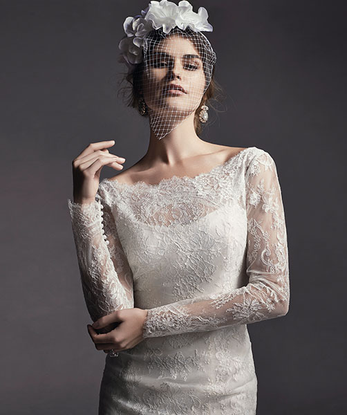 We love the drama of this sophisticated bridal look. The lace sleeves are ideal if you’d rather not show off your arms, or need a little more coverage for a winter wedding.