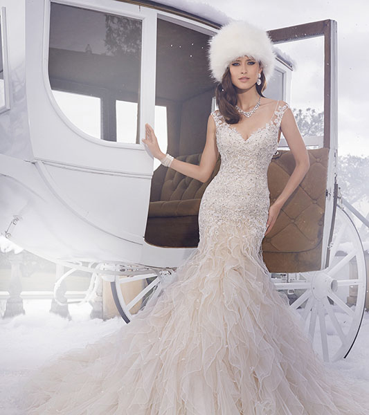 Show off your shape with this gorgeous figure-hugging gown with plenty of sparkle. The warm, Champagne colour is a classy alternative to white, too.