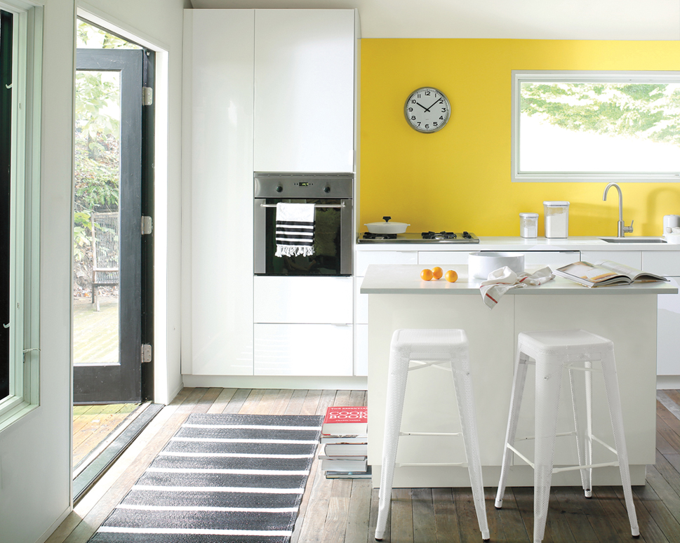 This Image: kitchen painted in Banana Yellow paint, Benjamin Moore
