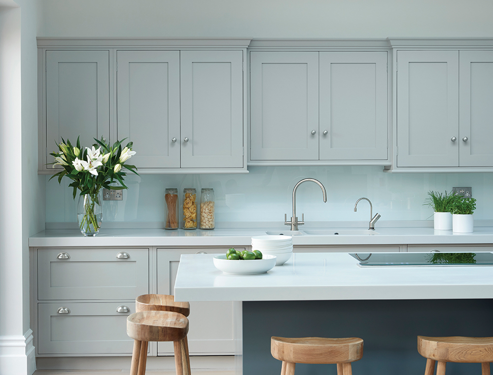 “Cromarty paint – inspired by sea mist – is a beautiful muted pastel that could be used on your cupboards to complement a neutral shade on the wall, such as Shadow White, one of our nine new colours this year.